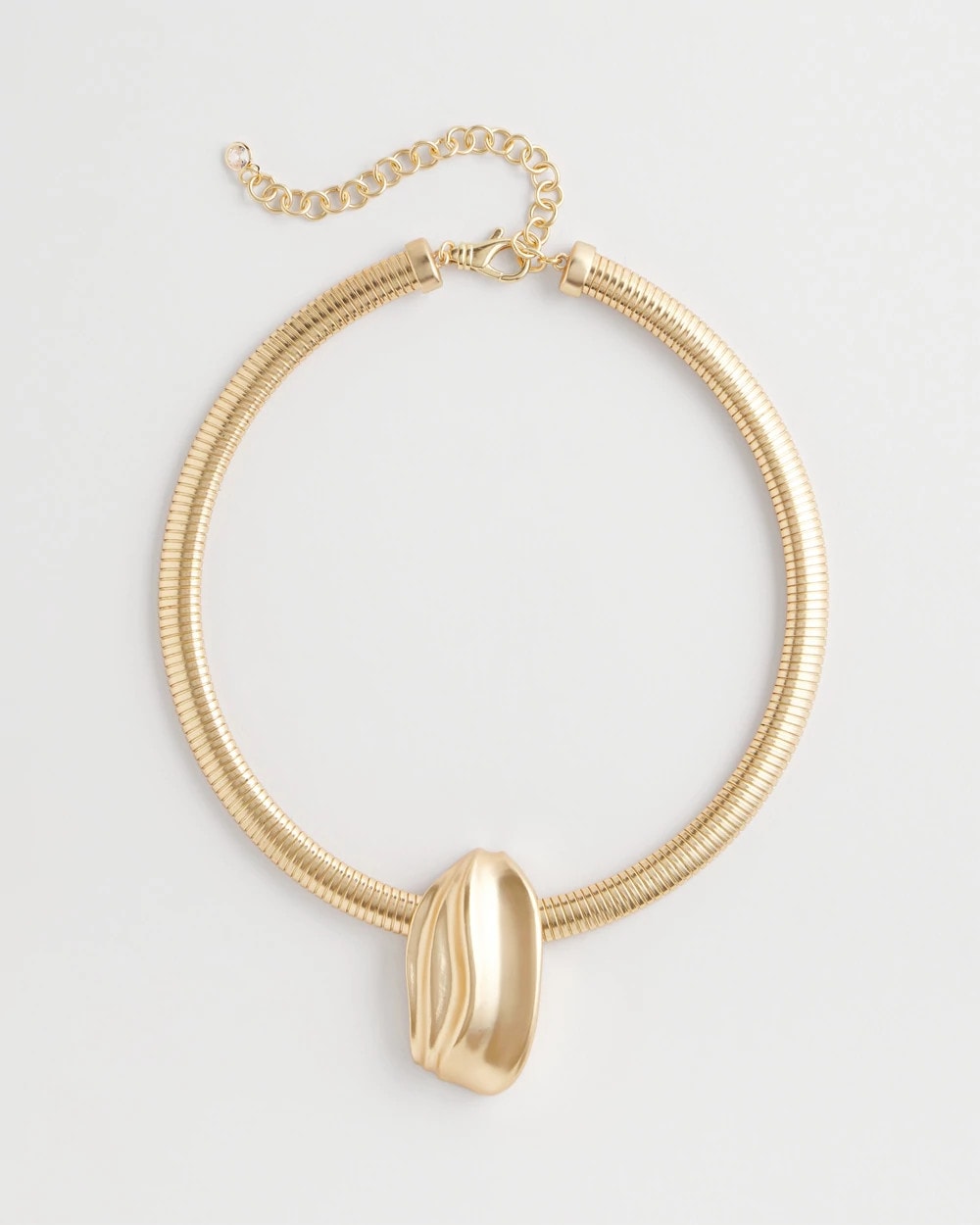 Glamour and luxury merge in this golden collar pendant necklace. Sleek, smooth, and refined, this necklace is part of our Ash Gold Collection. Layer with its matching pieces or wear on its own for a style that’s sure to turn heads.