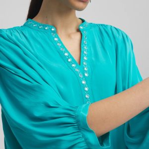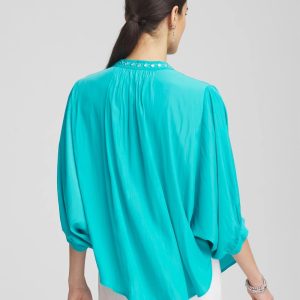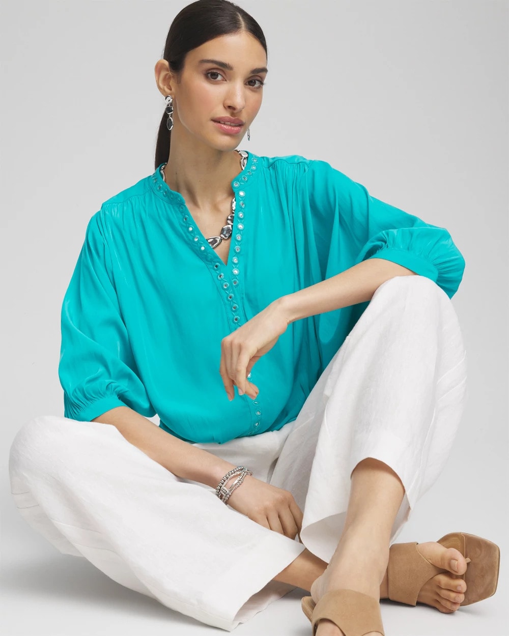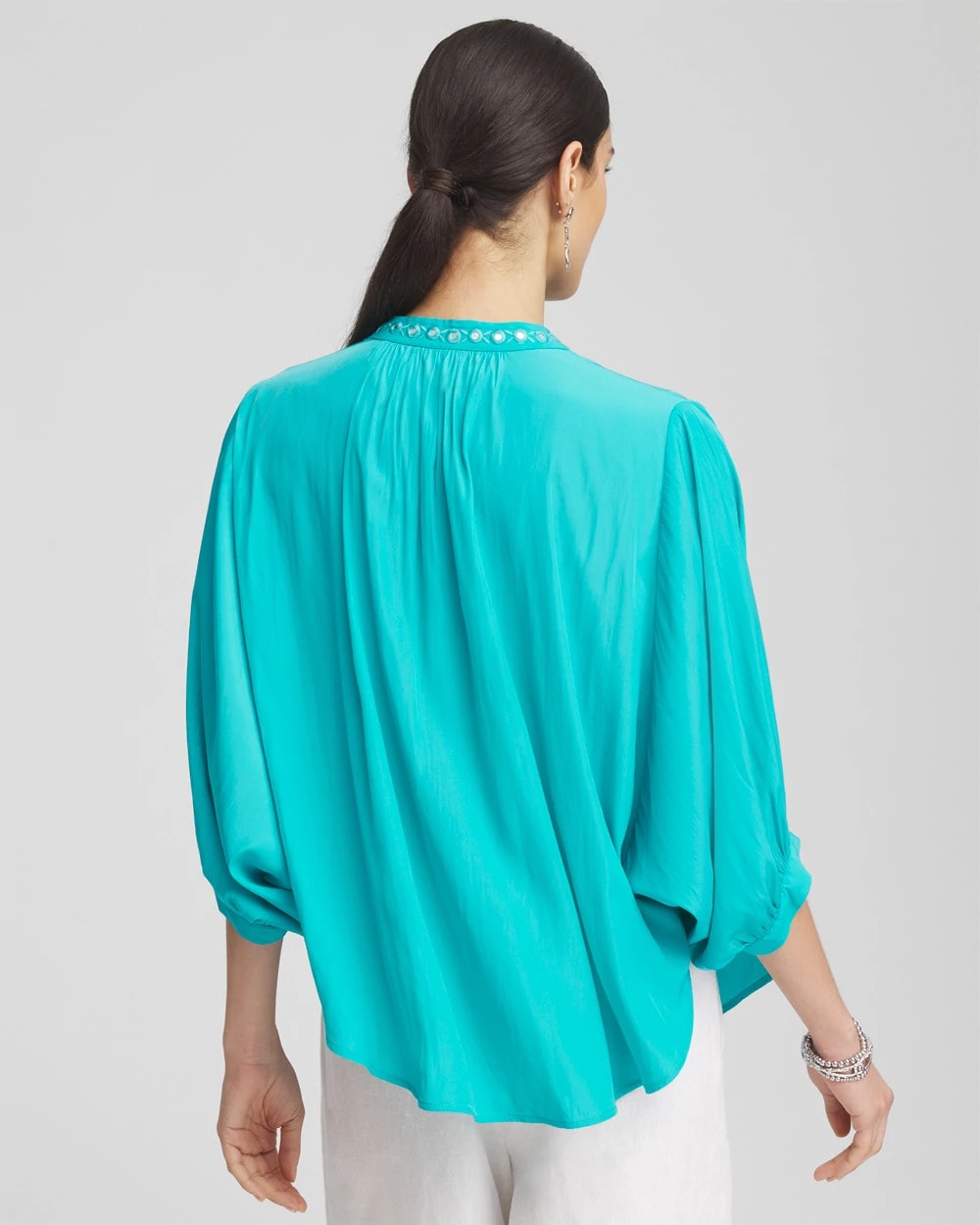 Embrace for the dramatic design sense of the season. Batwing sleeves, oversized, split neckline with an embellished placket. An ultra-stylish and flattering fit that pairs perfectly with almost any solid bottom.