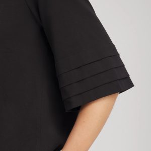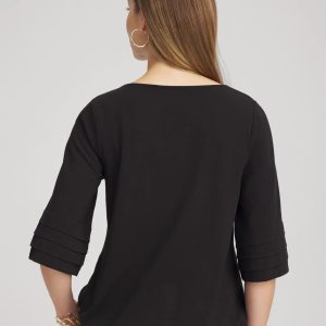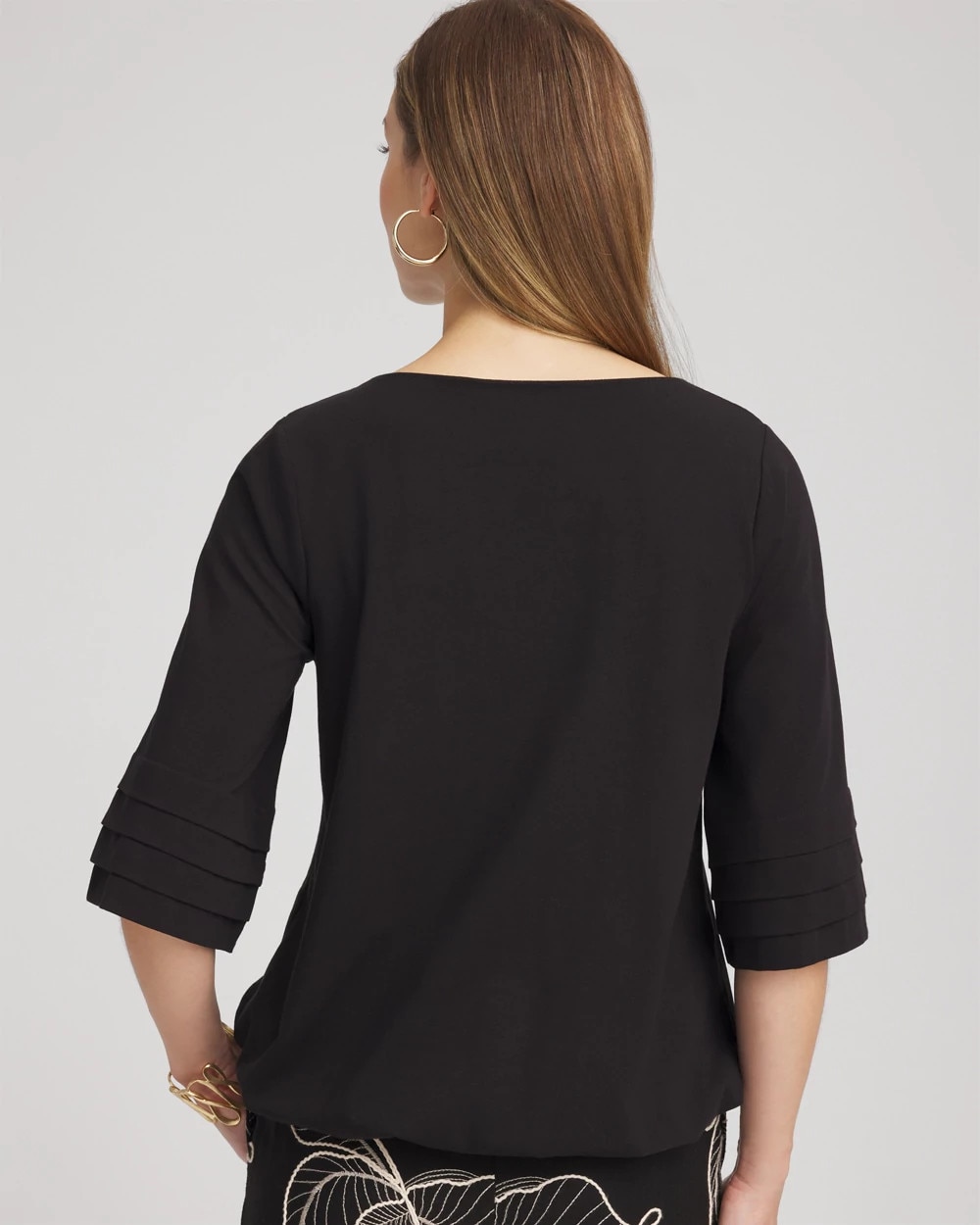 A luxurious alternative to a casual cotton top. Crafted of a cotton-blend fabrication, Chico’s bubble-hem top has tiered pleating details that elevate the—meticulously designed for feminine flare—bell sleeves. Showcasing a refined relaxed, lined body with unlined sleeves.