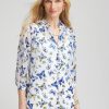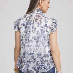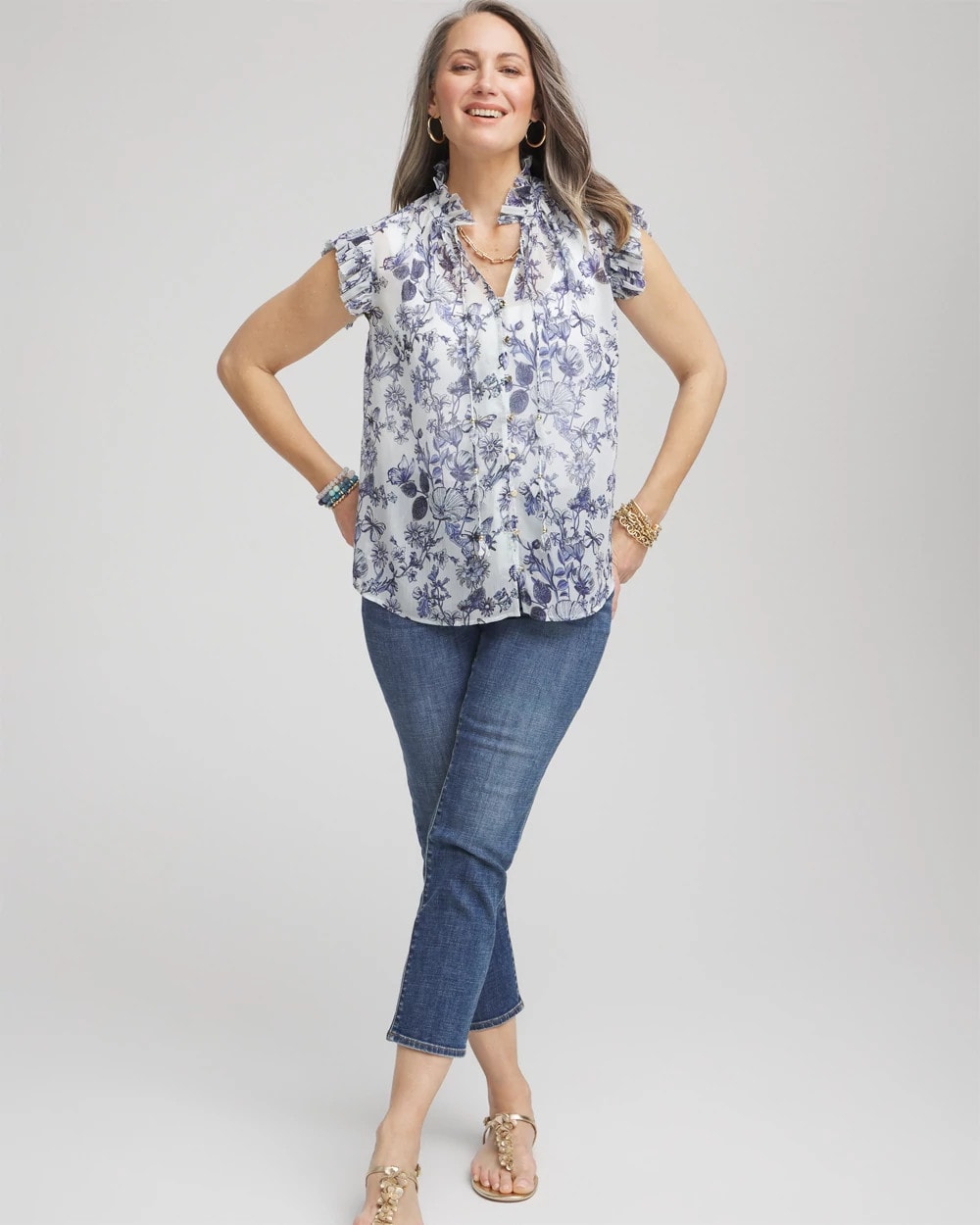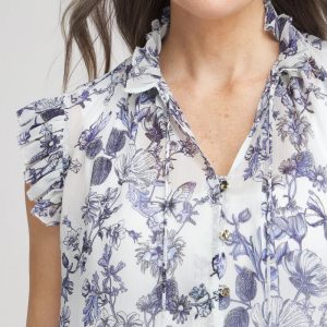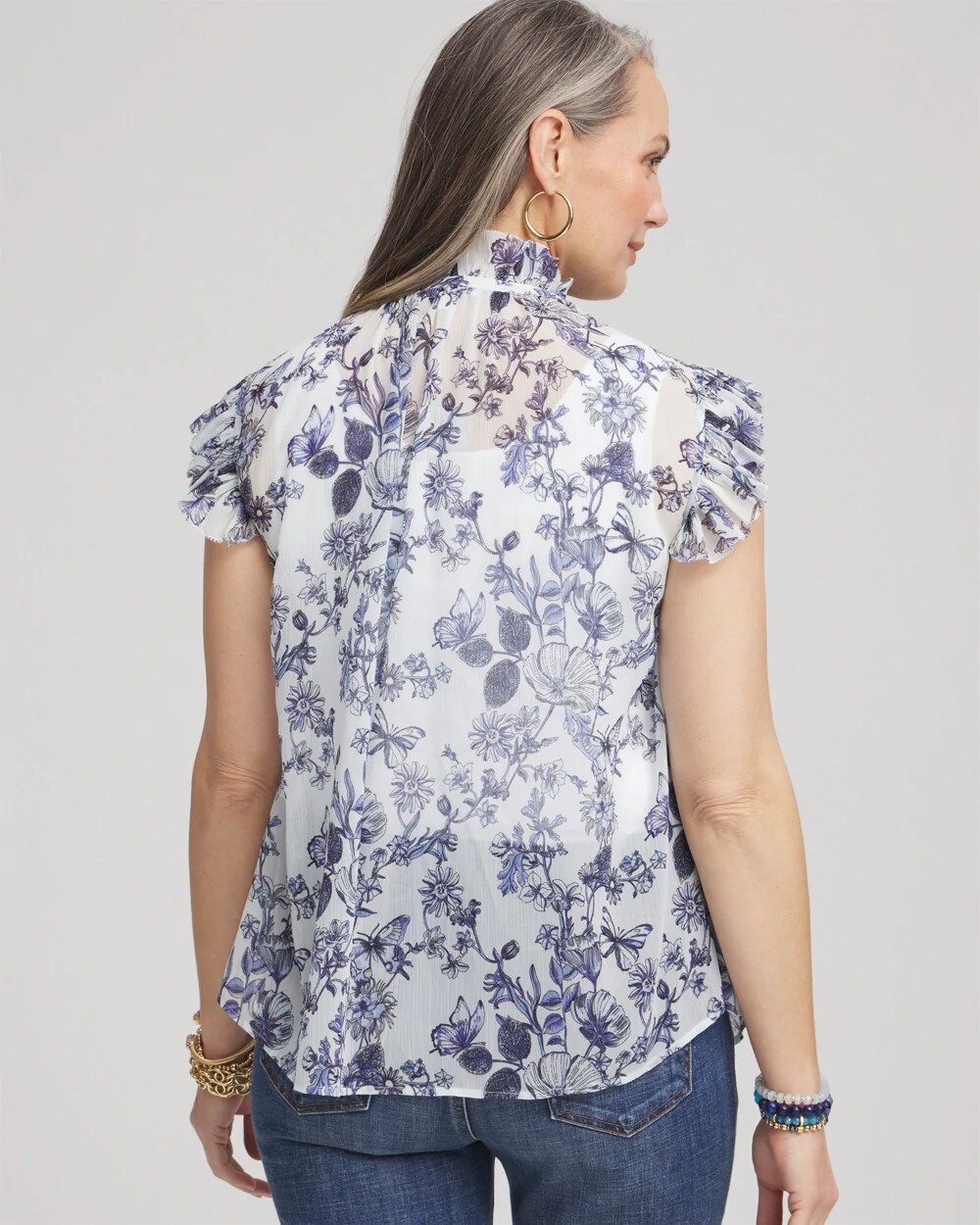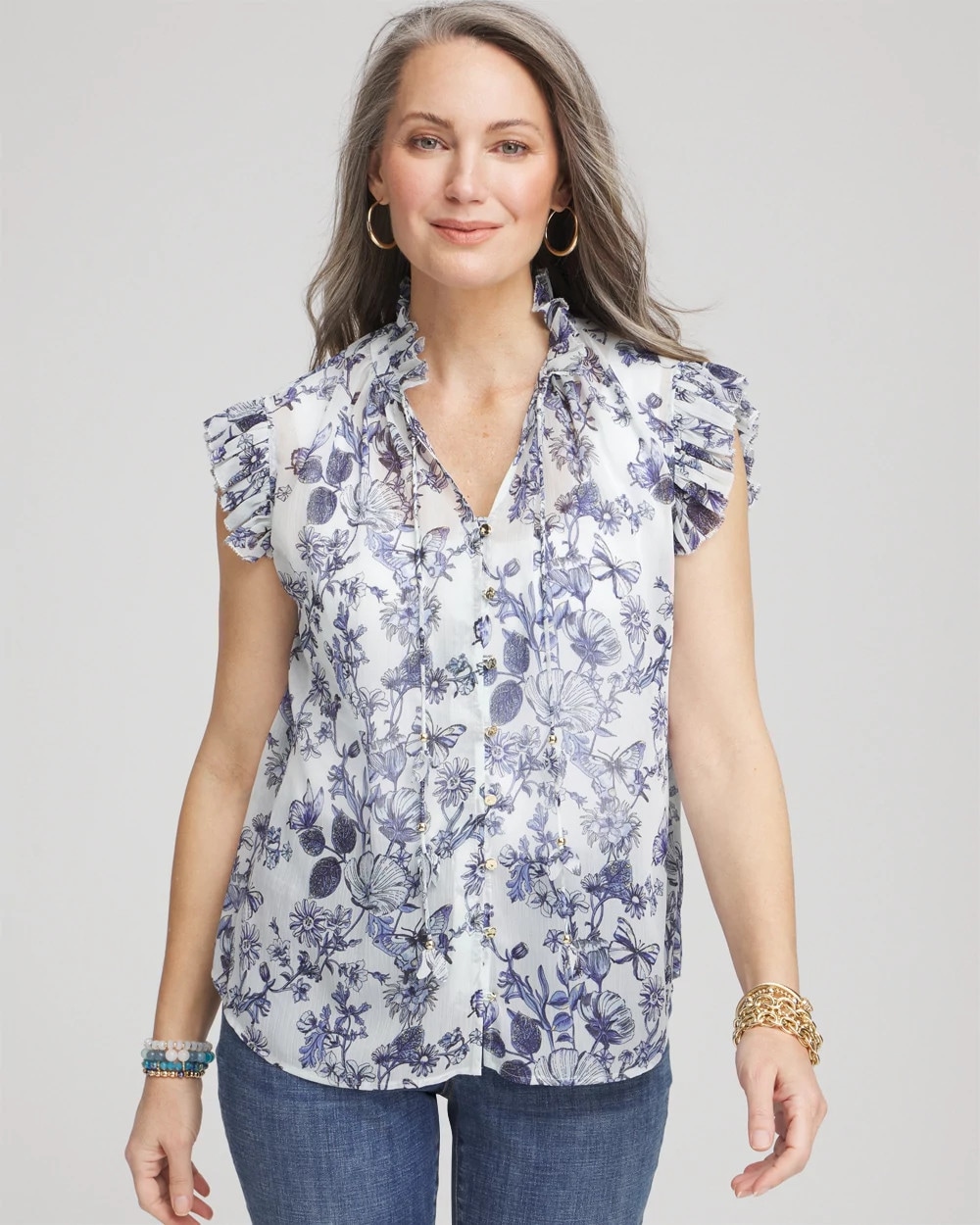 - Relaxed-fit; ruffle cap sleeves, stand collar, and tie-front closure.