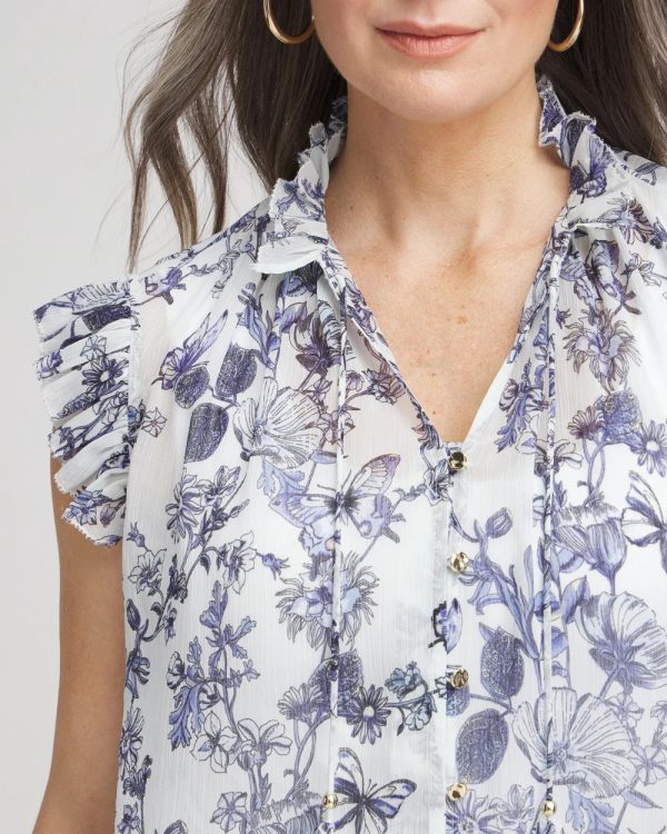 - Relaxed-fit; ruffle cap sleeves, stand collar, and tie-front closure.