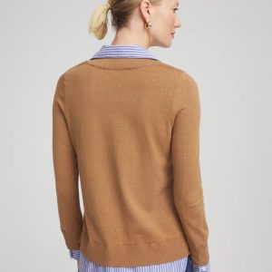 Get two in one with our Camel Built-In Shirt Knit Sweater. The cuff, collar, and hem details of a woven collared shirt are built-in to a soft, lightweight knit sweater. Wear this pullover with ankle jeans for a fast and flattering outfit.