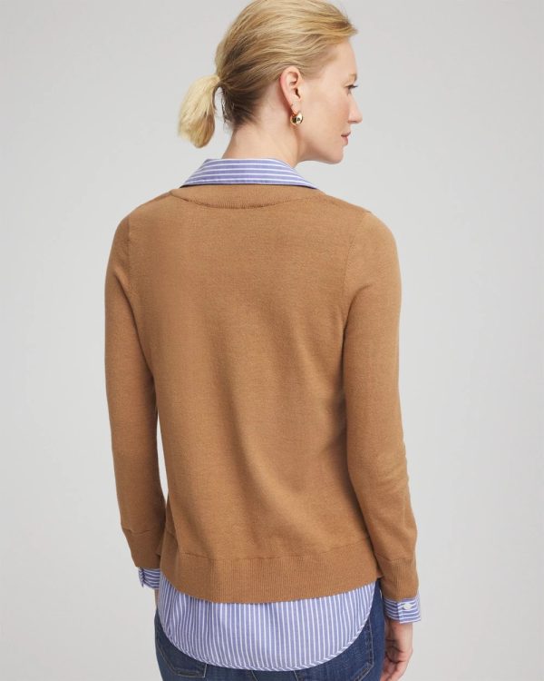 Get two in one with our Camel Built-In Shirt Knit Sweater. The cuff, collar, and hem details of a woven collared shirt are built-in to a soft, lightweight knit sweater. Wear this pullover with ankle jeans for a fast and flattering outfit.