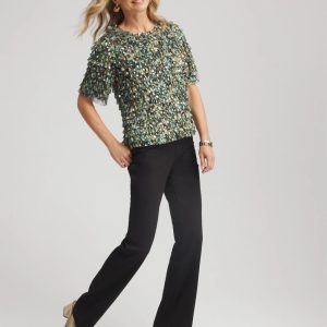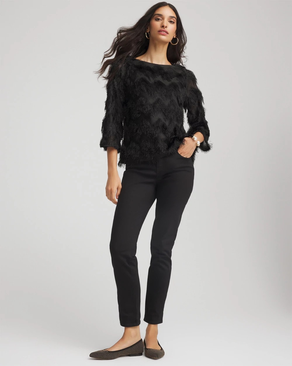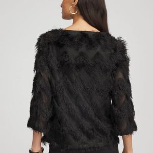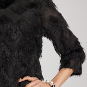 The perfect party top. Showcasing an all-over fringe with a chevron appearance. Featuring a jewel neckline and flawless fit, this top is an outfit maker. Pair with the season’s matching chevron fringe party skirt.