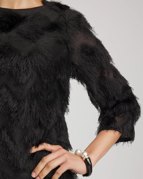The perfect party top. Showcasing an all-over fringe with a chevron appearance. Featuring a jewel neckline and flawless fit, this top is an outfit maker. Pair with the season’s matching chevron fringe party skirt.