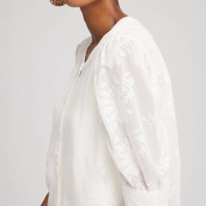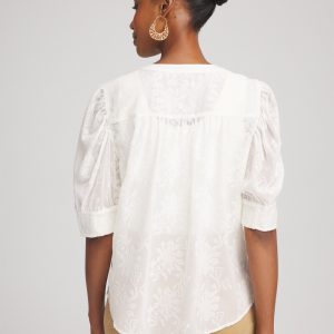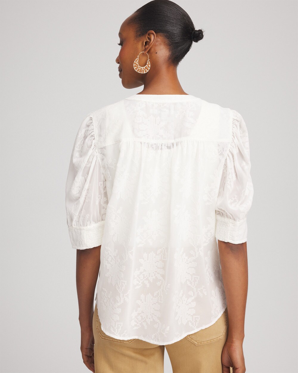 Flowy chiffon fabrication that has been woven for softness, tailored for a sheer motif featuring a romantic cross-stitch pattern, helps define the elevated elegance of this band-collar shirt. Pair with a matching Microfiber Tank by Chico’s.