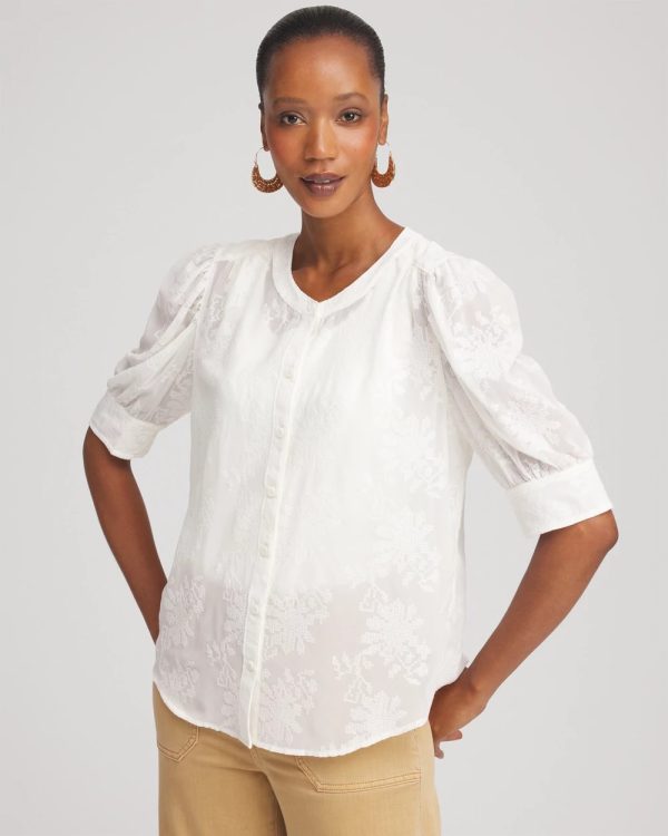 Flowy chiffon fabrication that has been woven for softness, tailored for a sheer motif featuring a romantic cross-stitch pattern, helps define the elevated elegance of this band-collar shirt. Pair with a matching Microfiber Tank by Chico’s.