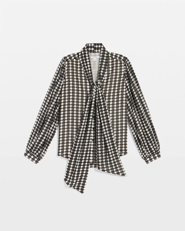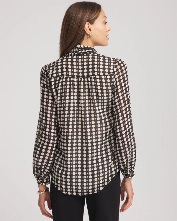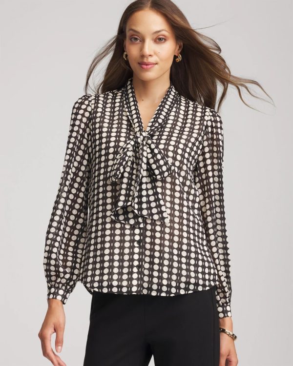 Infused with romantic style, this Clip-Dot Tie-Front Blouse is cut from luxurious chiffon fabric in a clip-dot polka-dot design. Featuring a tie-front neckline, georgette lining, and blouson sleeves. Pair this elegant style with jeans or cropped pants to strike a casual balance, Emme, Brigitte, or Juliet pants for a more upscale style.
