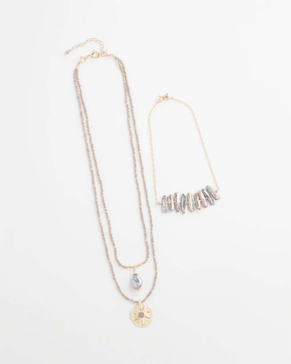 The perfect travel necklace. Luxurious and rare abalone shells and limitless ways to wear. Style as a three-strand, two-strand or single-strand layering piece featuring sand dollar, pearlescent, and abalone shell pendants. Showcasing three pendants with genuine abalone shell and diamond-like accents.