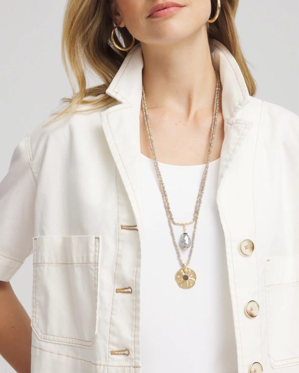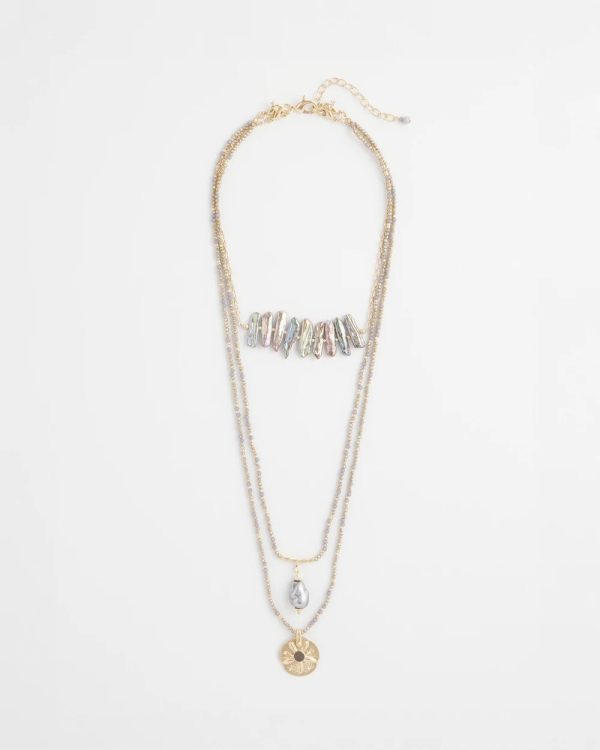 The perfect travel necklace. Luxurious and rare abalone shells and limitless ways to wear. Style as a three-strand, two-strand or single-strand layering piece featuring sand dollar, pearlescent, and abalone shell pendants. Showcasing three pendants with genuine abalone shell and diamond-like accents.
