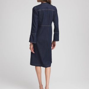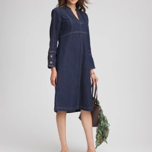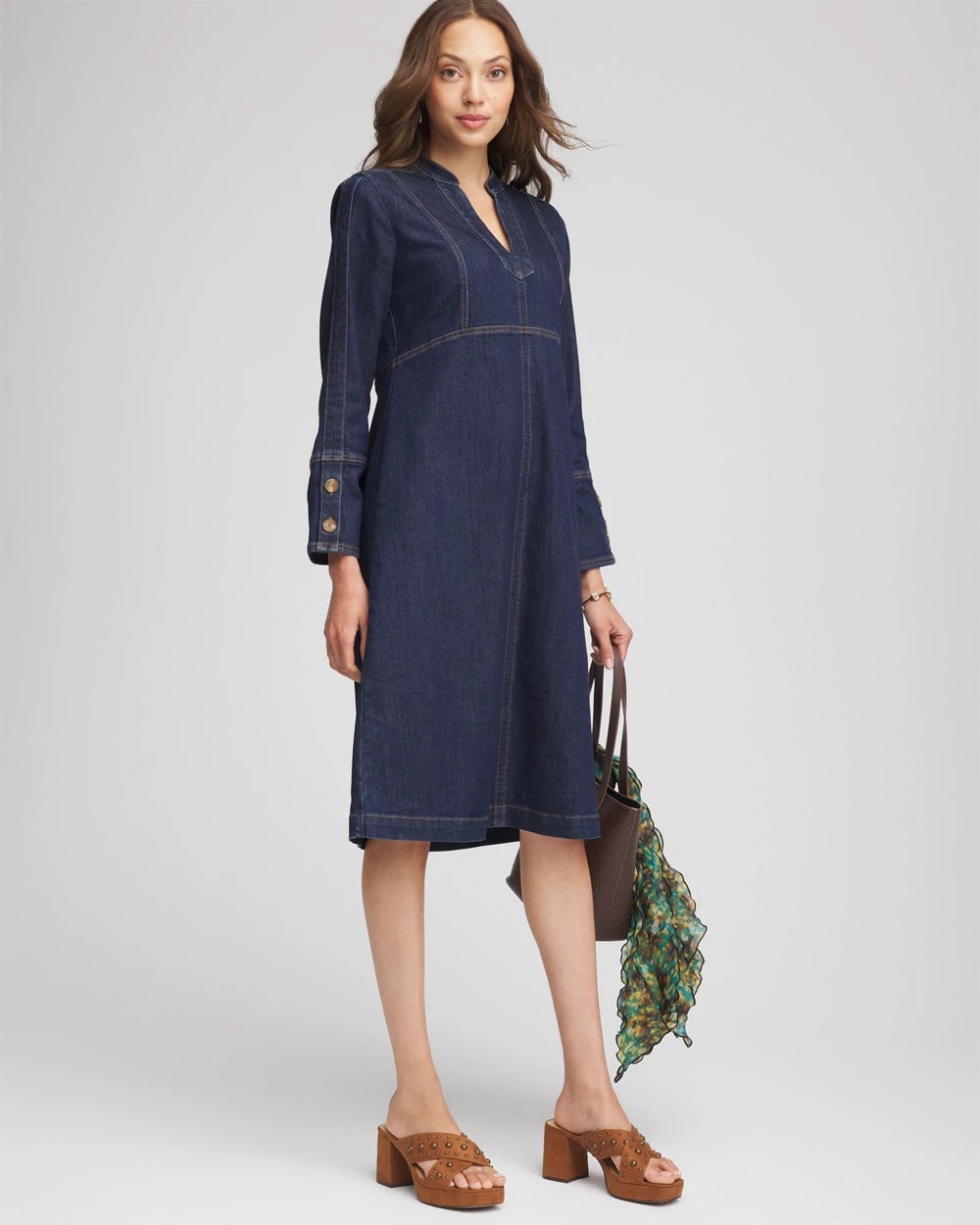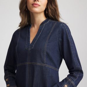 A sleek dark wash denim and intricate seaming details designed to slenderize your shape help define thisDenim Splitneck Knee-Length Dress.