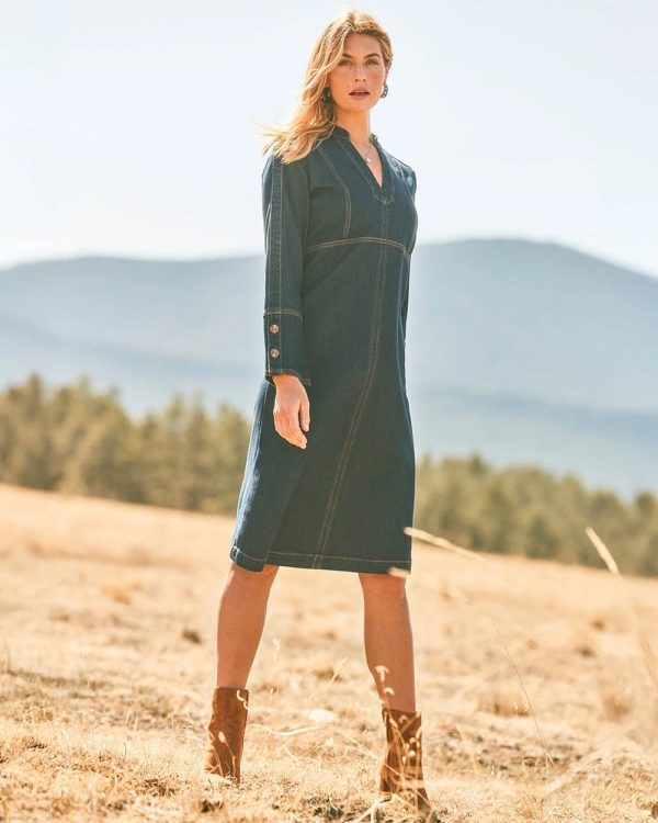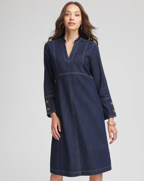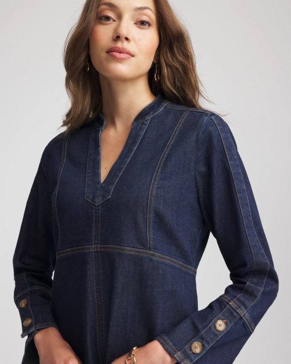 A sleek dark wash denim and intricate seaming details designed to slenderize your shape help define thisDenim Splitneck Knee-Length Dress.