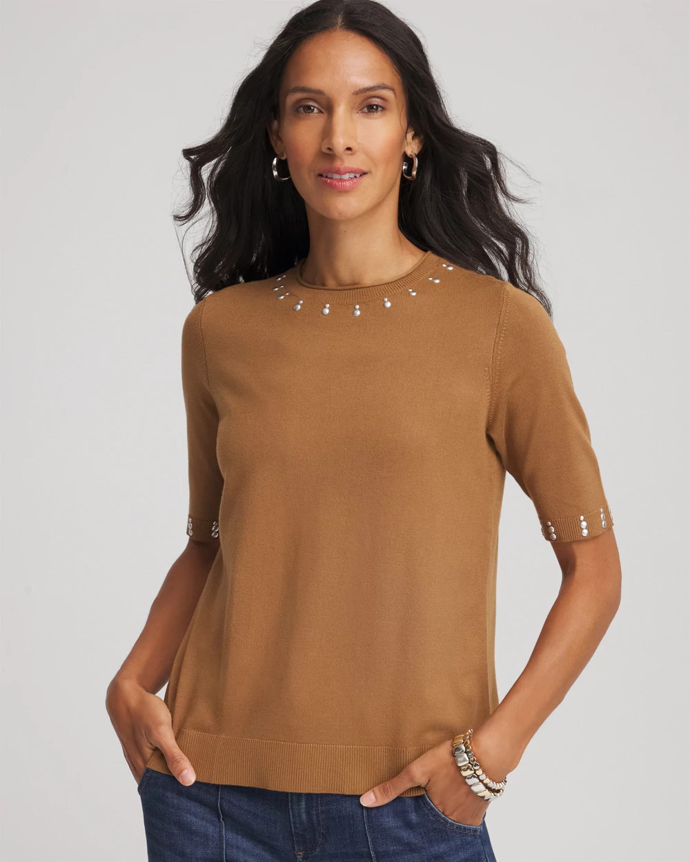 Rendered in soft spun rayon, this classic-fit sweater takes its cues from classic t-shirt designs, including a subtle ribbed trim showcasing a heat-set diamond motif embellishment. Pair with Chico’s jeans, Emme, Juliet or Brigitte™ pants.