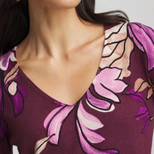 The Ella V-Neck Artisanal Pullover Sweater, in a rich Chianti, showcasing an artistic print, placed in a way that flatters your shape while merging art and fashion. The cuffs have ribbing and non-functional button detailing for added depth and texture. Paired with our Brigitte™, Emme pants or jeans, this sweater is sure to be one of your all-time favorites.
