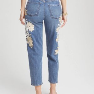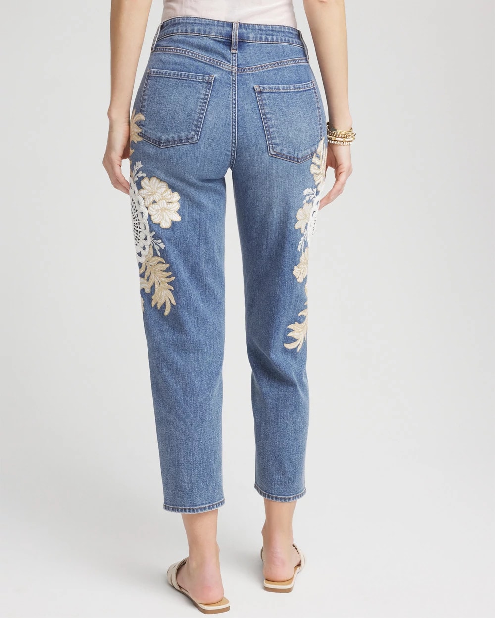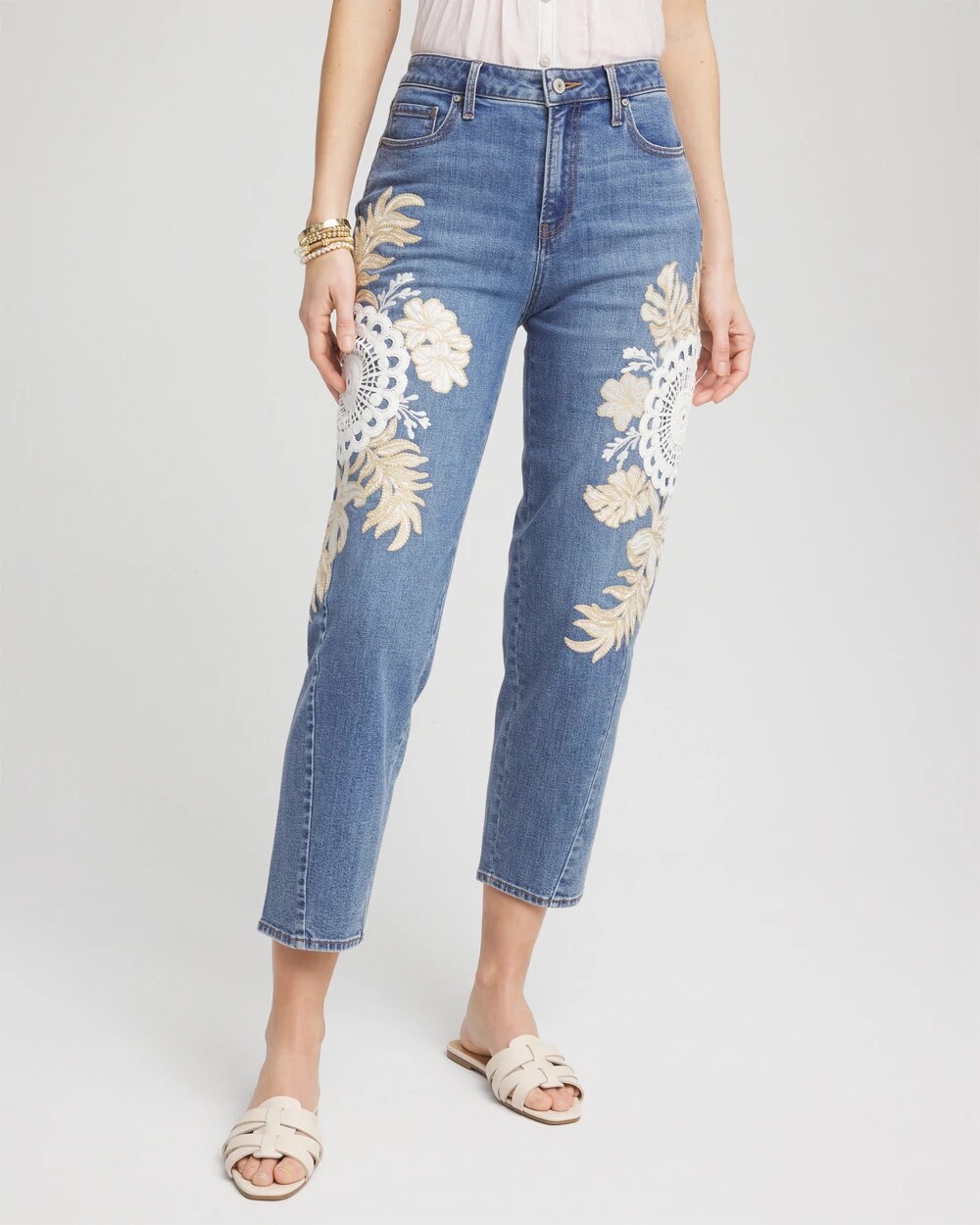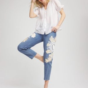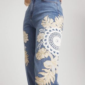 Made with comfortable lightwash denim, these mid-rise jeans are defined by a relaxed, tapered silhouette detailed with neutral medallion-floral embroidery with crochet applique at each leg.If you love boyfriend jeans, you’ll love this perfect pair of jeans, featuring a more relaxed leg and thigh with a tapered hem and cropped fit.