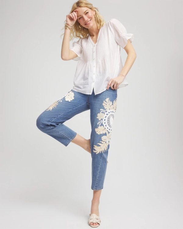 Made with comfortable lightwash denim, these mid-rise jeans are defined by a relaxed, tapered silhouette detailed with neutral medallion-floral embroidery with crochet applique at each leg.If you love boyfriend jeans, you’ll love this perfect pair of jeans, featuring a more relaxed leg and thigh with a tapered hem and cropped fit.