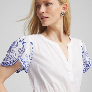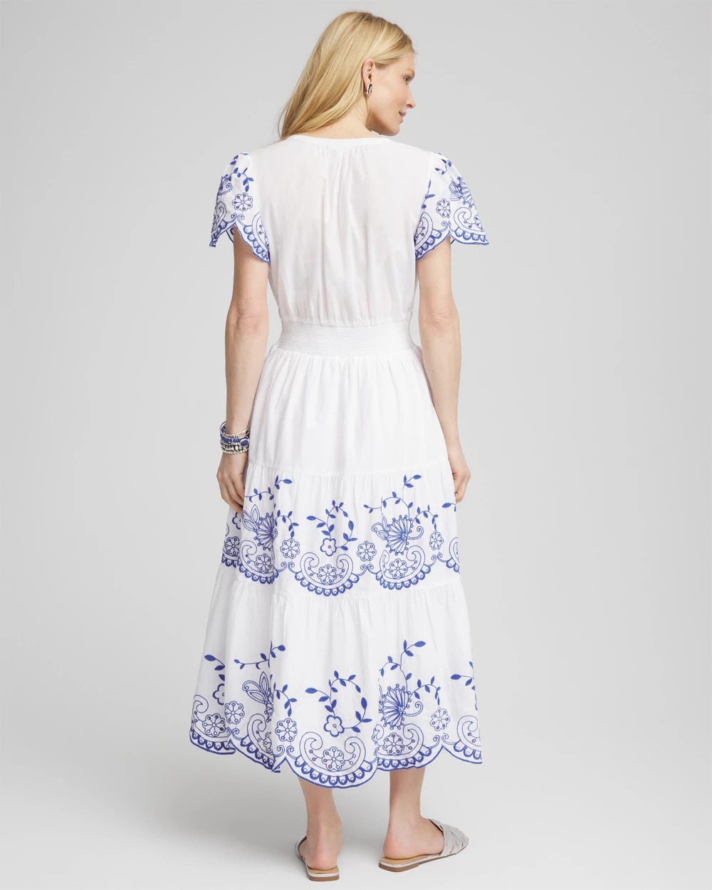This delicately embroidered design is made from lightweight cotton voile fabric, and features a flattering multi-tiered skirt, plus a split neckline, scalloped hemline, and a flattering smocked waist.