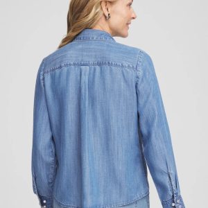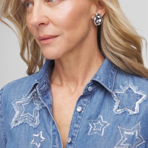 A classic denim shirt, re-imagined for the season. Showcasing festive star patchwork and embroidery detailing on a light, lived-in look Tencel™ denim backdrop. Stand collar with lapels, button-front, long-sleeved with a clean finish back yoke seam. Pair with matching jeans for a head-to-toe denim style.