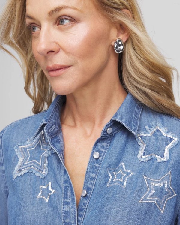 A classic denim shirt, re-imagined for the season. Showcasing festive star patchwork and embroidery detailing on a light, lived-in look Tencel™ denim backdrop. Stand collar with lapels, button-front, long-sleeved with a clean finish back yoke seam. Pair with matching jeans for a head-to-toe denim style.