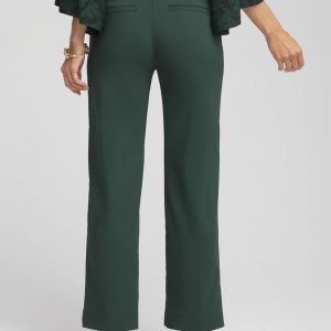 - Straight-leg fly front ankle pants. Rise sits just below the natural waist.