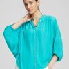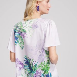 Where comfort and style collide: short flutter sleeves with a side panel for added movement and a classic crewneckline top. Showcasing a painterly palm tree print in rich blue, purple, and green hues set against a gentle lavender backdrop. Dress up this polished beachy blouse with blue or white pants or go for a casual look by pairing with jeans.