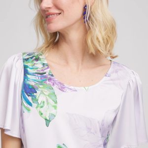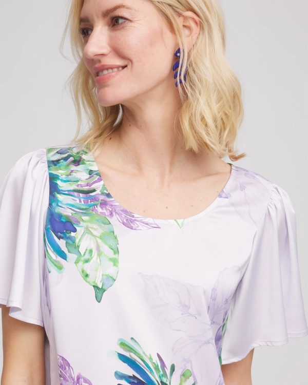 Where comfort and style collide: short flutter sleeves with a side panel for added movement and a classic crewneckline top. Showcasing a painterly palm tree print in rich blue, purple, and green hues set against a gentle lavender backdrop. Dress up this polished beachy blouse with blue or white pants or go for a casual look by pairing with jeans.