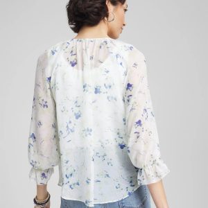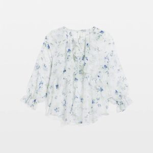 - Relaxed-fit with long sleeves, ruffled elastic cuffs, jewel neckline.