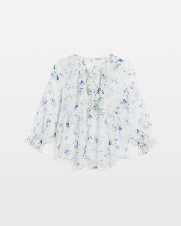 - Relaxed-fit with long sleeves, ruffled elastic cuffs, jewel neckline.