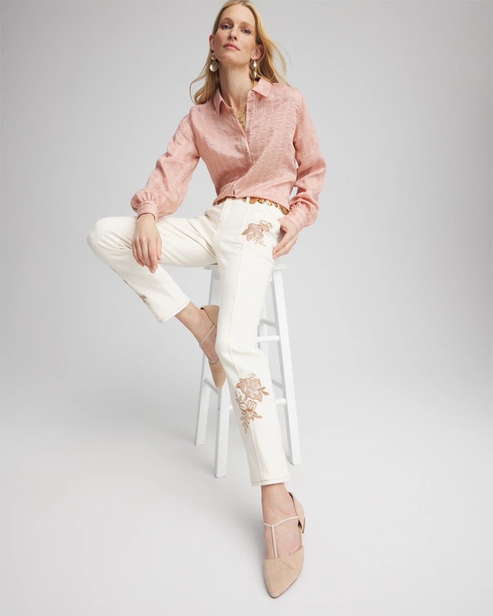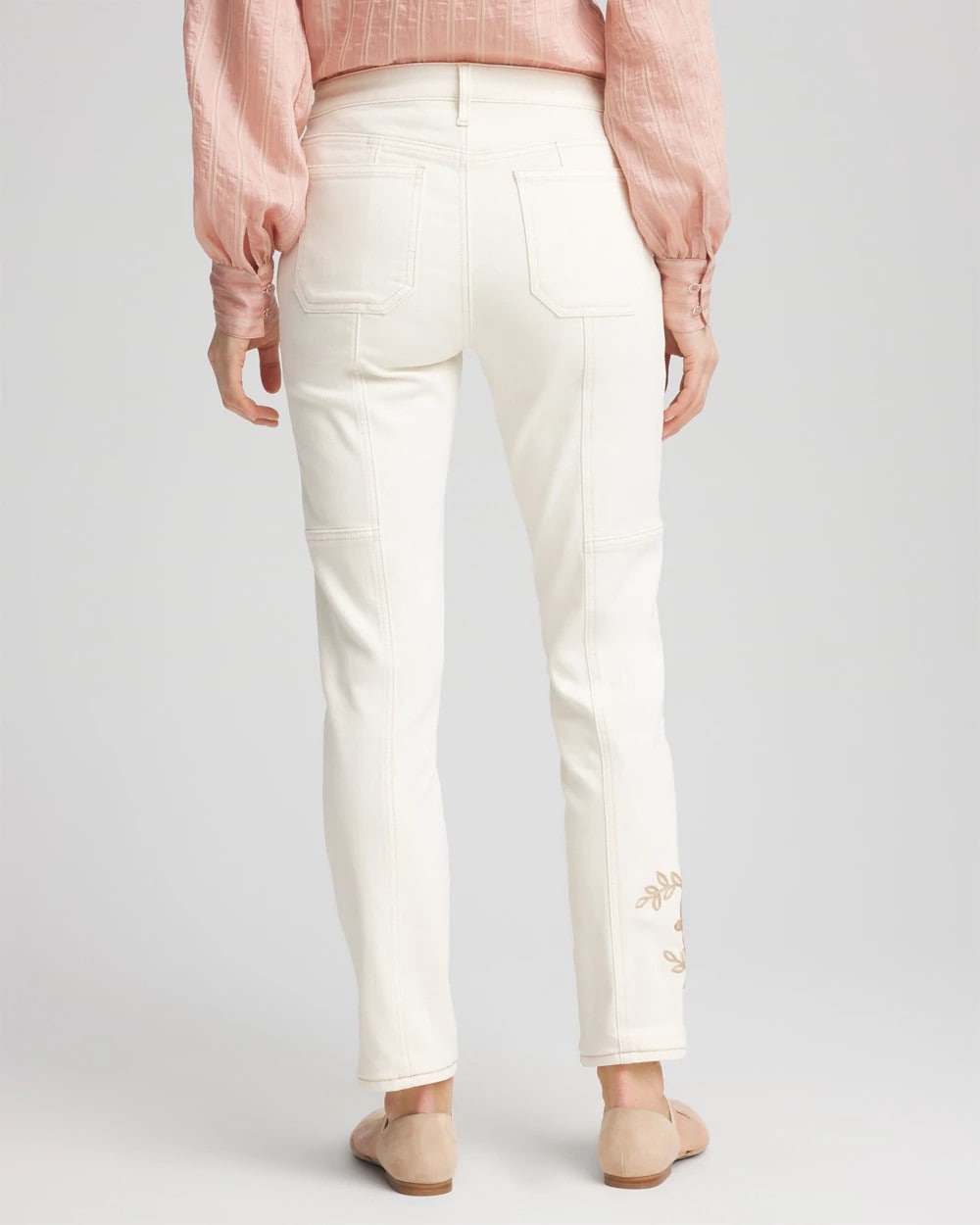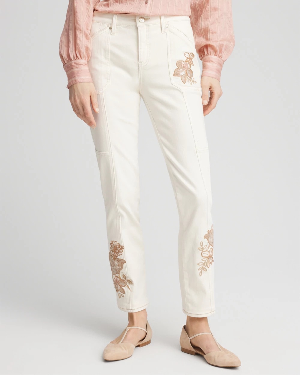 Inspired by vintage carpenter pants from the ’90s, introducing Chico’s new Girlfriend Ankle Utility Jeans. Showcasing authentic details, including oversized patch pockets and flattering seam detailing. Featuring Chico’s built-in shaping solution, So Slimming® inner panel.