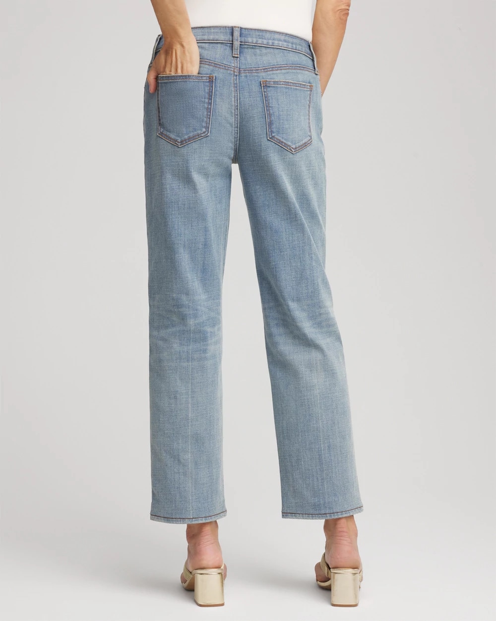 Made with a gentle light wash denim showcasing vintage character—washed for a white hue and treated with grinding appeal. These classic-rise jeans are cut for a straight silhouette, ankle length. Featuring a tummy slimming interior that lifts and shapes your figure, courtesy of Chico’s proprietary So Slimming® technology.