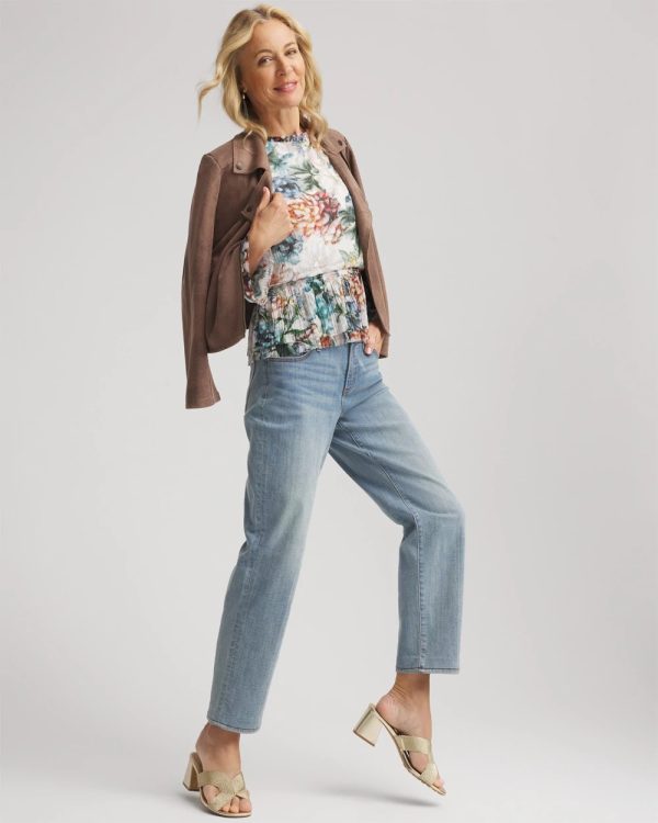 Made with a gentle light wash denim showcasing vintage character—washed for a white hue and treated with grinding appeal. These classic-rise jeans are cut for a straight silhouette, ankle length. Featuring a tummy slimming interior that lifts and shapes your figure, courtesy of Chico’s proprietary So Slimming® technology.
