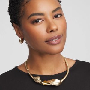 A glamorous golden leaf centered around a collar necklace helps define this new head-turning piece. Pair with like earrings, bracelets, and layering necklaces from Chico’s Gold Fashion Collection.