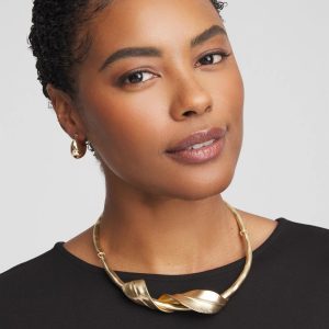A glamorous golden leaf centered around a collar necklace helps define this new head-turning piece. Pair with like earrings, bracelets, and layering necklaces from Chico’s Gold Fashion Collection.