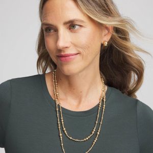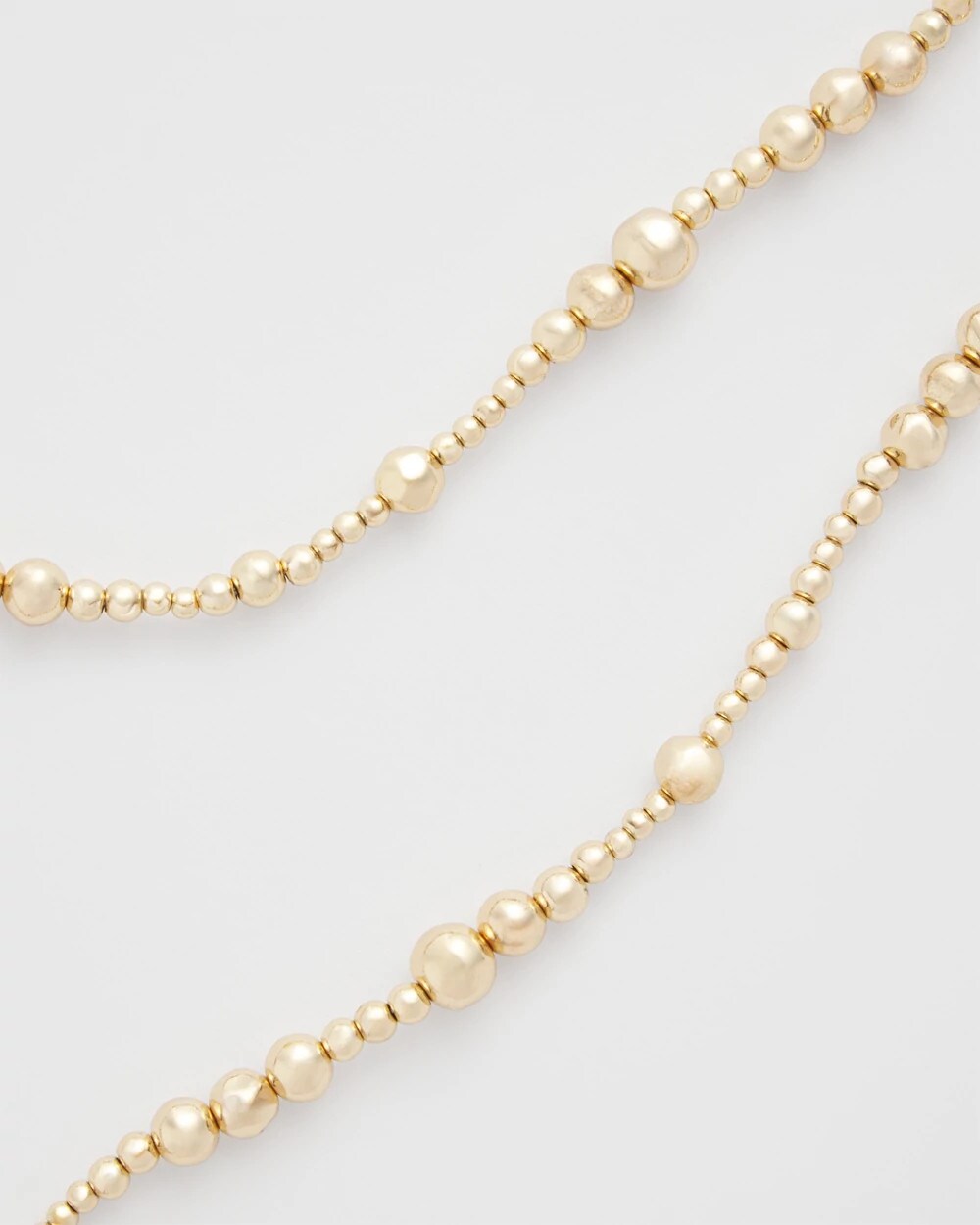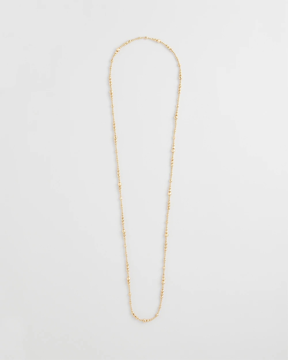 Shiny golden beads with a luxurious drape help define thisGoldtone Long Beaded Necklace. Perfect for pairing with Chico’s gold tone Tennis Necklaces or on its own as a single long strand or shorter stacked piece.