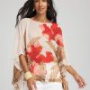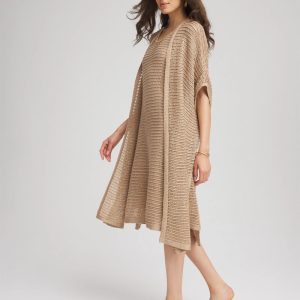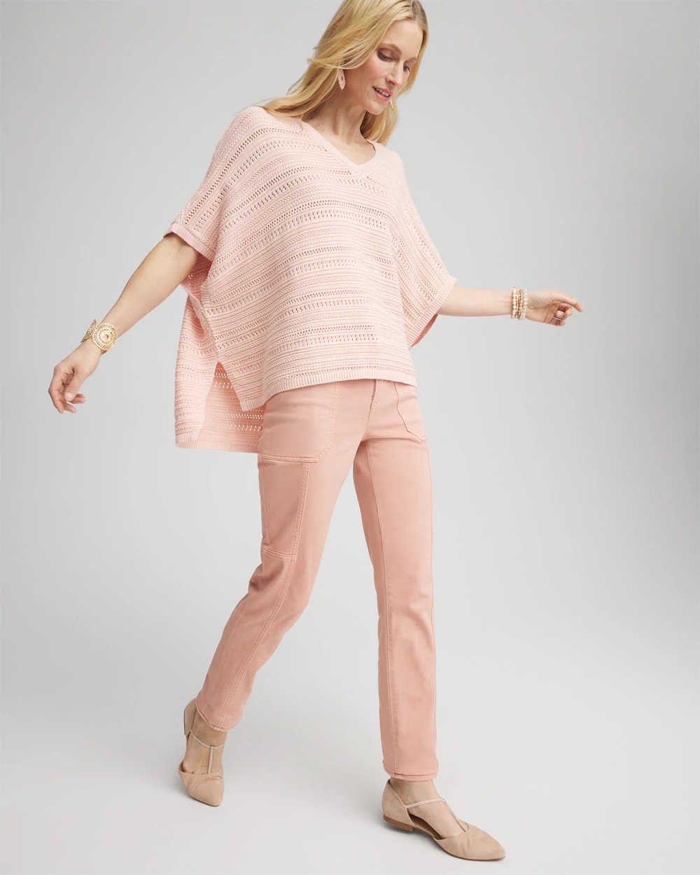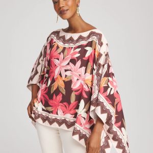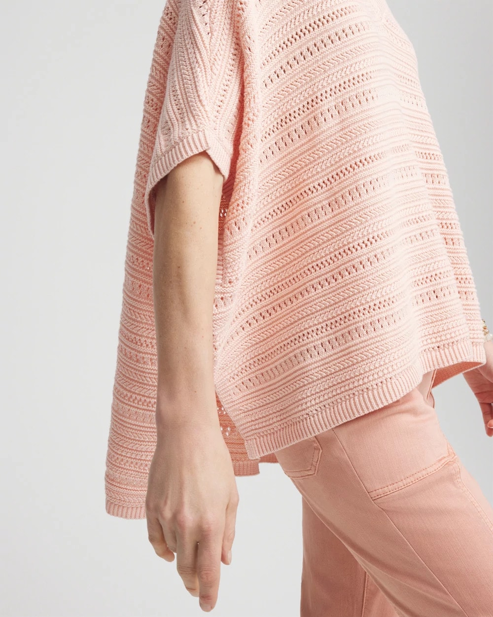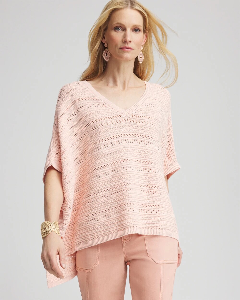 - Hi-lo hem poncho, v-neck and elbow-length sleeves.