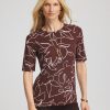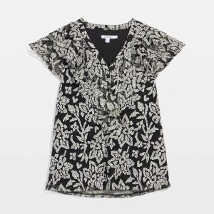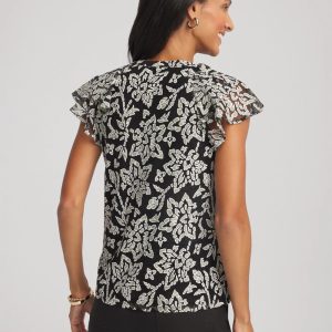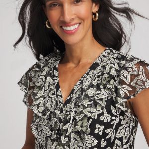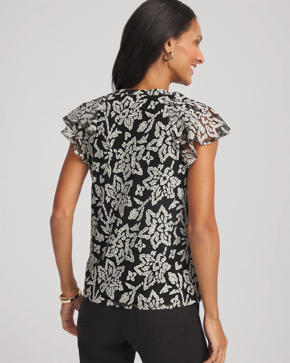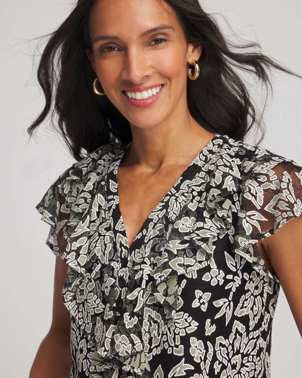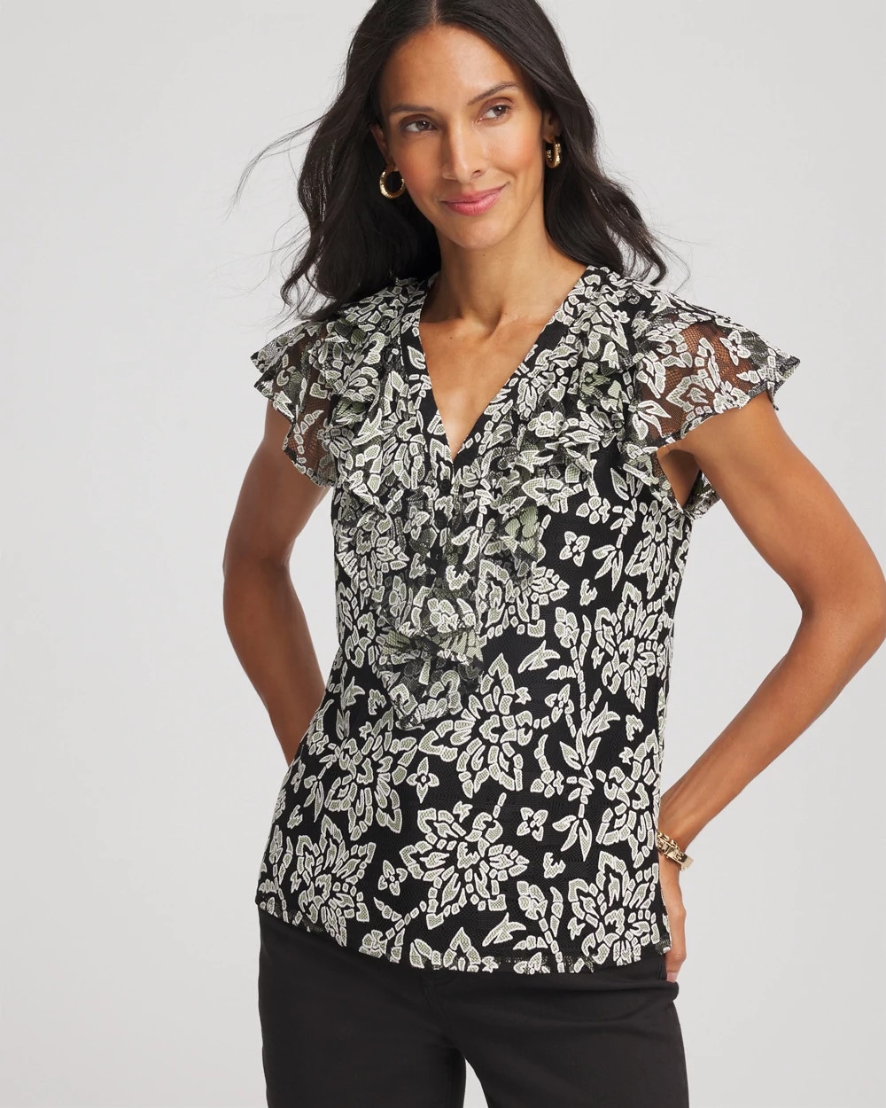 Floral burnout in a light hue with a dark backdrop and a ruffled sleeve and placket help define this high-styleLace Floral-Burnout Henley Tee. Cut from a cotton-blend fabric featuring a jersey knit lining.