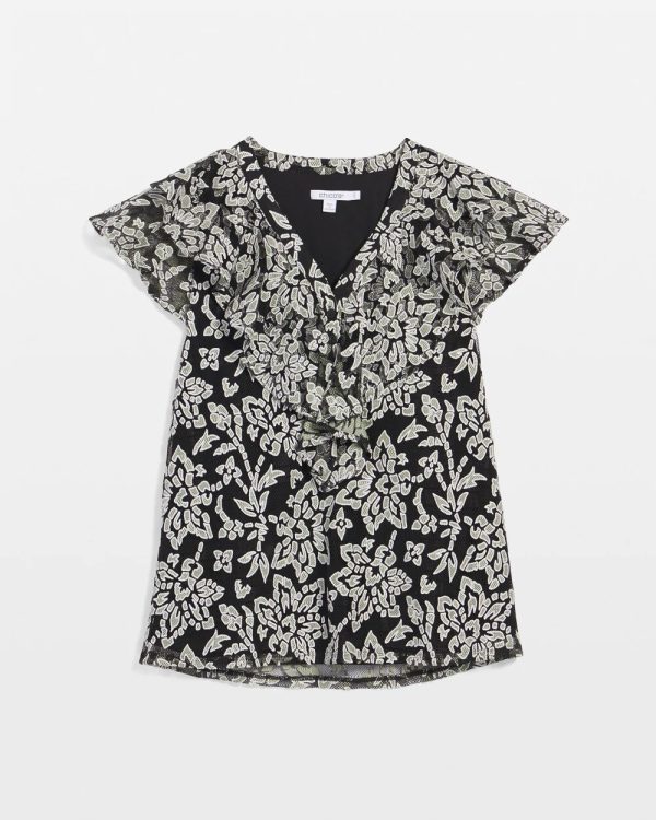 Floral burnout in a light hue with a dark backdrop and a ruffled sleeve and placket help define this high-styleLace Floral-Burnout Henley Tee. Cut from a cotton-blend fabric featuring a jersey knit lining.