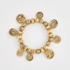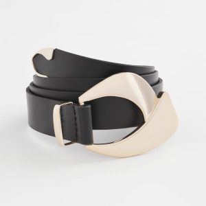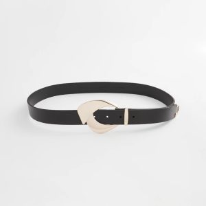 An angular, fashionable buckle in gold tones against a sleek black leather strap help define this Chico’sLeather Trouser Belt.