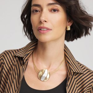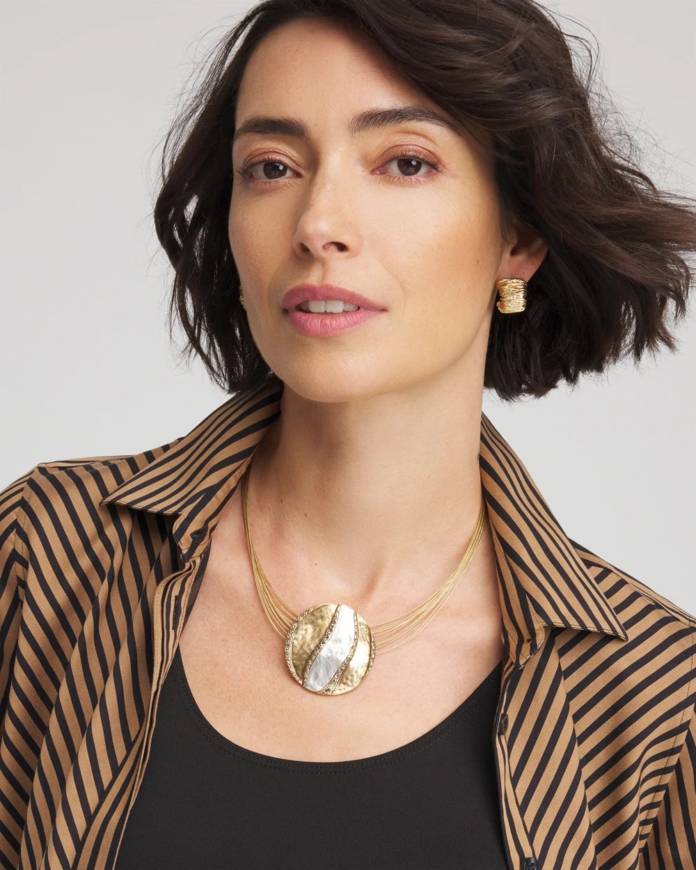 A glamorous gold and silver tone pendant hangs from multiple sleek strands, showcasing an ultra sparkly mixed-metal circle that draws the eye. Pair this Mixed-Metal Safari Pendant Necklace with other gold and silver tones from our Chico’s jewelry collections.