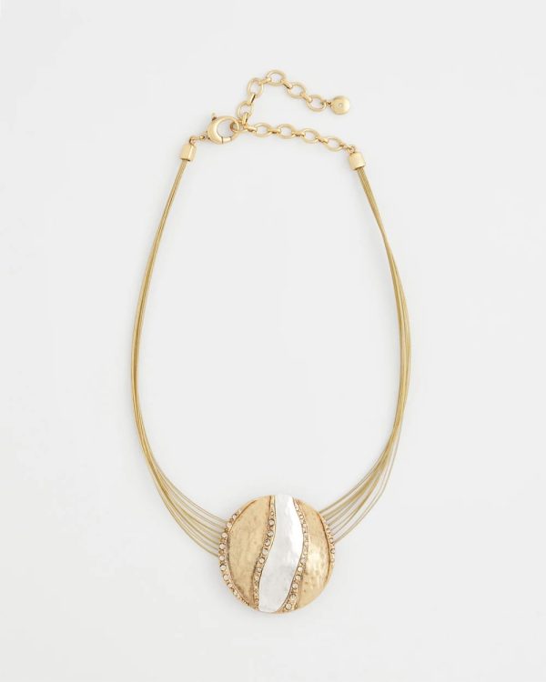 A glamorous gold and silver tone pendant hangs from multiple sleek strands, showcasing an ultra sparkly mixed-metal circle that draws the eye. Pair this Mixed-Metal Safari Pendant Necklace with other gold and silver tones from our Chico’s jewelry collections.