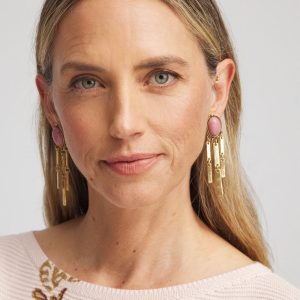Statement linear drop earrings showcasing striking rhodonite and jasper stones draped alongside rich golden metals. Can be worn to elevate your casual wear or as the finishing touch to your more glamorous styles.Featuring Chico’s proprietary No Droop® technology to create statement styles without the weight on your earlobes.Pair with matching linear statement necklace—for the full effect—and other pieces from Chico’s Regional Gems Pink Collection.