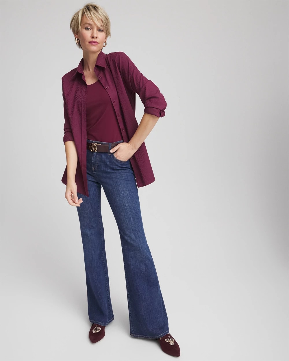 Our instantly bestselling No Iron™ Shirt showcasing the season’s warming jacquard animal motif in Chianti red. We can’t keep our classic-fit No Iron™ stretch-sateen shirts in stock. This ready-to-wear right out of the dryer (without the hassle of ironing) top moves with you effortlessly for all-day comfort. It’s a straight silhouette with a point collar. Flawless every time in any season, whether on its own or as a base layer. Designed with a flattering shirttail hem and gusset featuring our CC Chico’s logo. This button front pairs perfectly with jeans or pants.