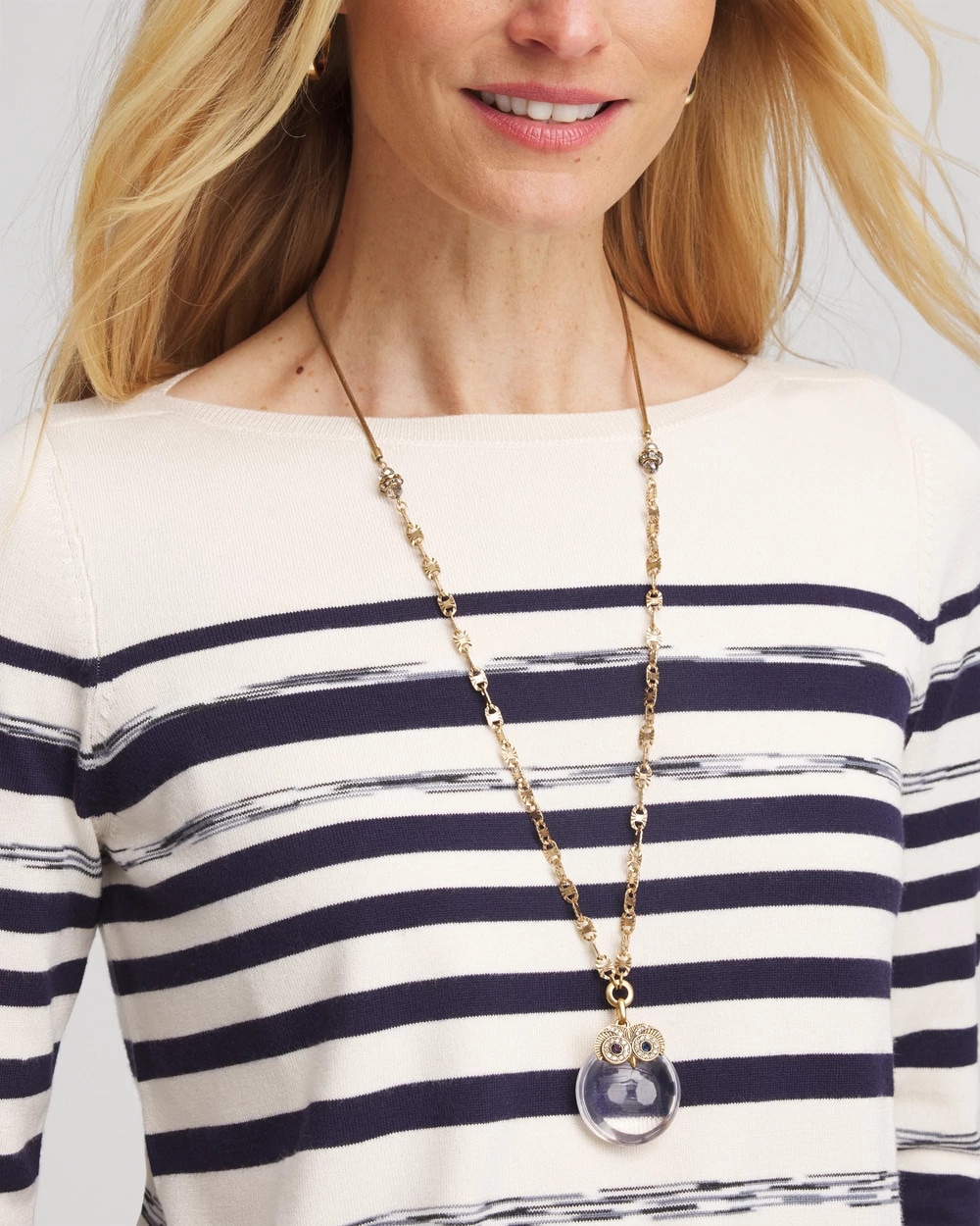 Striking, gemmy owl eyes and a beautiful brass chain help define thisOwl Pendant Necklace. Pair with pieces from Chico’s Birds of a Feather Collection.