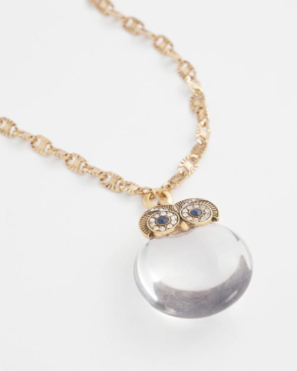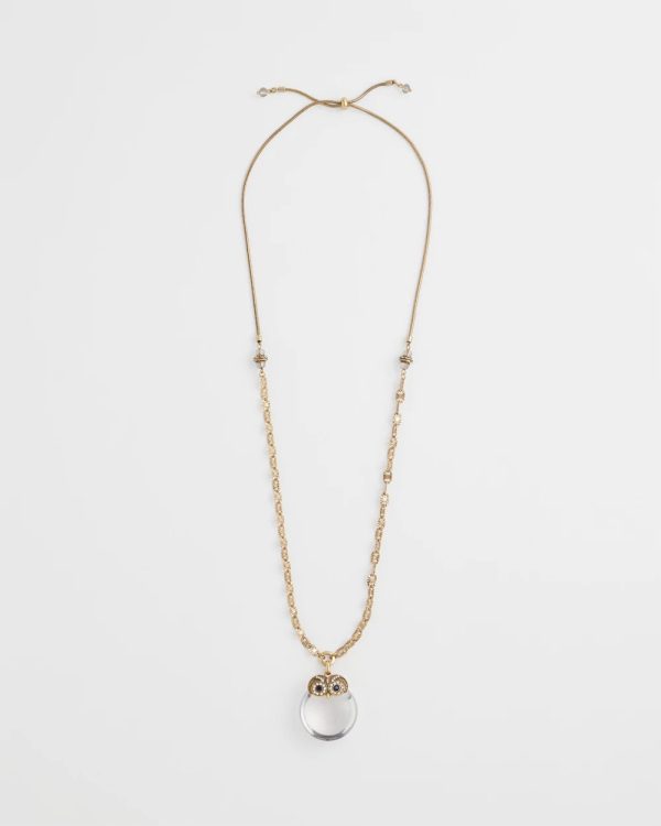 Striking, gemmy owl eyes and a beautiful brass chain help define thisOwl Pendant Necklace. Pair with pieces from Chico’s Birds of a Feather Collection.