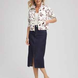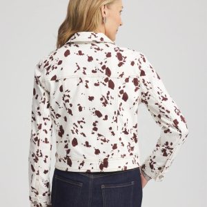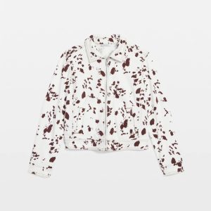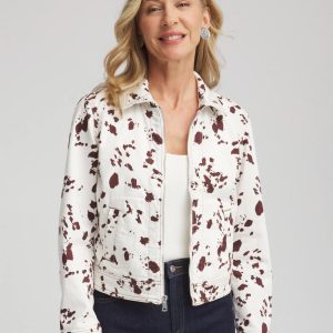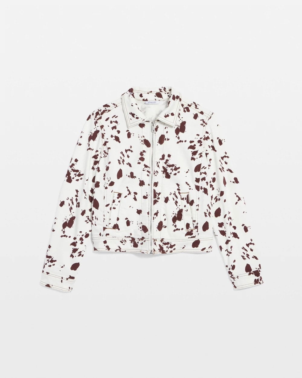 Add a dash of vintage ’90s style to your wardrobe with this retro ‘cowgirl chic’ denim jacket showcasing a masterfully crafted animal cow-print, mimicking cowhide with a special technique. Featuring front angled pockets, lapel point collar, and zip front. For the full Western-inspired effect, pair with the matching neckerchief and jeans.