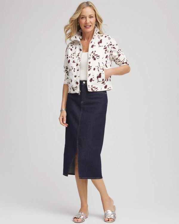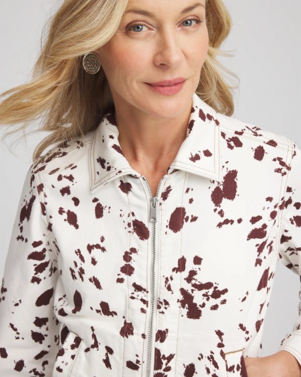 Add a dash of vintage ’90s style to your wardrobe with this retro ‘cowgirl chic’ denim jacket showcasing a masterfully crafted animal cow-print, mimicking cowhide with a special technique. Featuring front angled pockets, lapel point collar, and zip front. For the full Western-inspired effect, pair with the matching neckerchief and jeans.