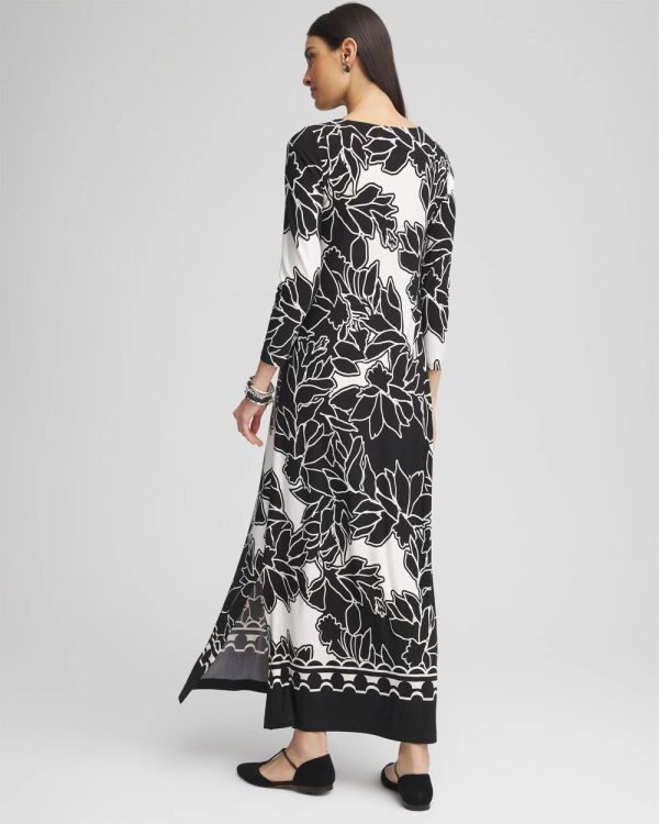 Add this new stunning style to your dress wardrobe, Chico’s Bateau-Neck Jersey Maxi Dress features a printed border hemline, flattering maxi silhouette, side-slit, and long sleeves.