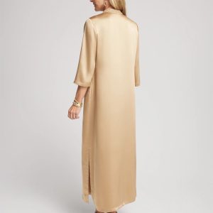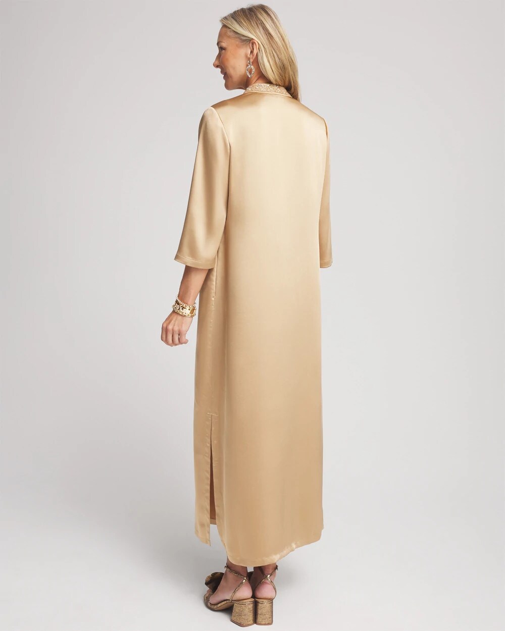 Sleek and sophisticated, our new Embellished Satin Maxi Dress is here. Be the first of your friends to add this glamorous new style to your wardrobe. Wear to holiday parties, galas or gatherings and be the center of attention. Pair with Chico’s gold heels and stacked bracelets.