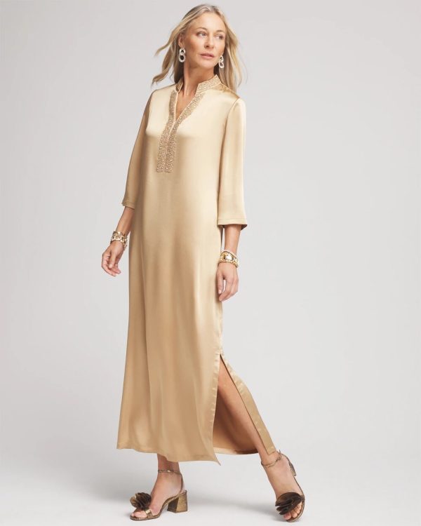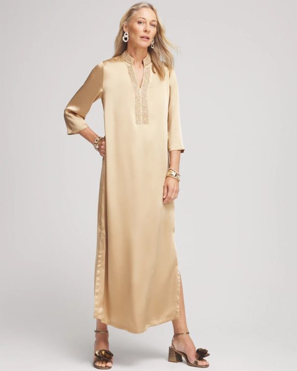 Sleek and sophisticated, our new Embellished Satin Maxi Dress is here. Be the first of your friends to add this glamorous new style to your wardrobe. Wear to holiday parties, galas or gatherings and be the center of attention. Pair with Chico’s gold heels and stacked bracelets.