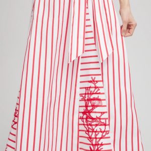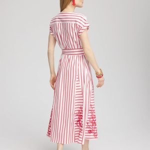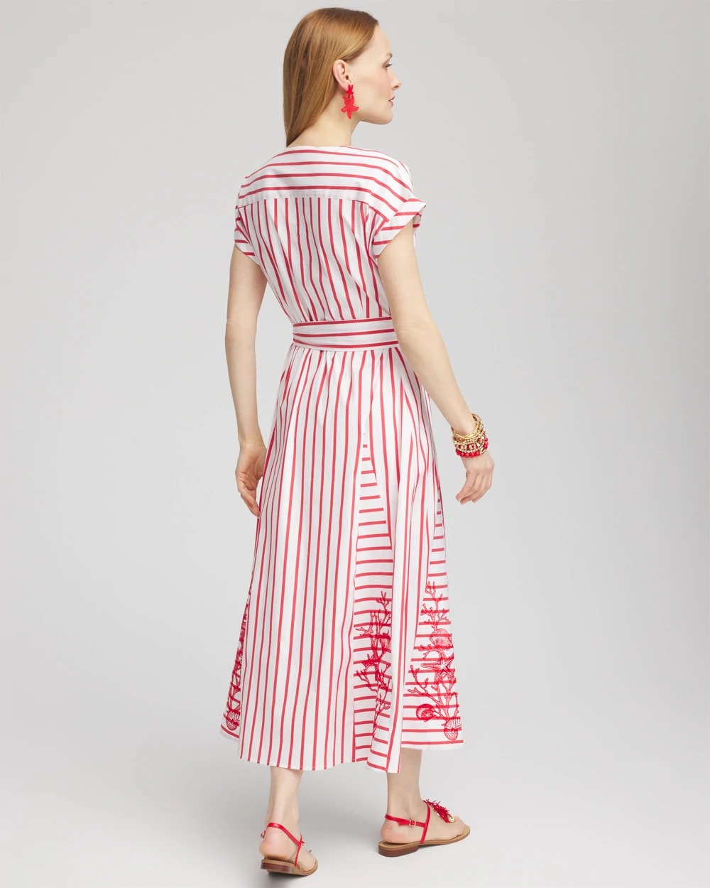 This new Striped Godet Poplin-Maxi Dress is designed with cuffed short sleeves and a breezy fit-and-flare silhouette. Its paneled skirt features inset godets with an intricate ocean-inspired coral reef embroidery, showcasing Chico’s devotion to stunning design. The perfect dress for Memorial Day, pair with matching coral reef motif jewelry for a showstopping look.